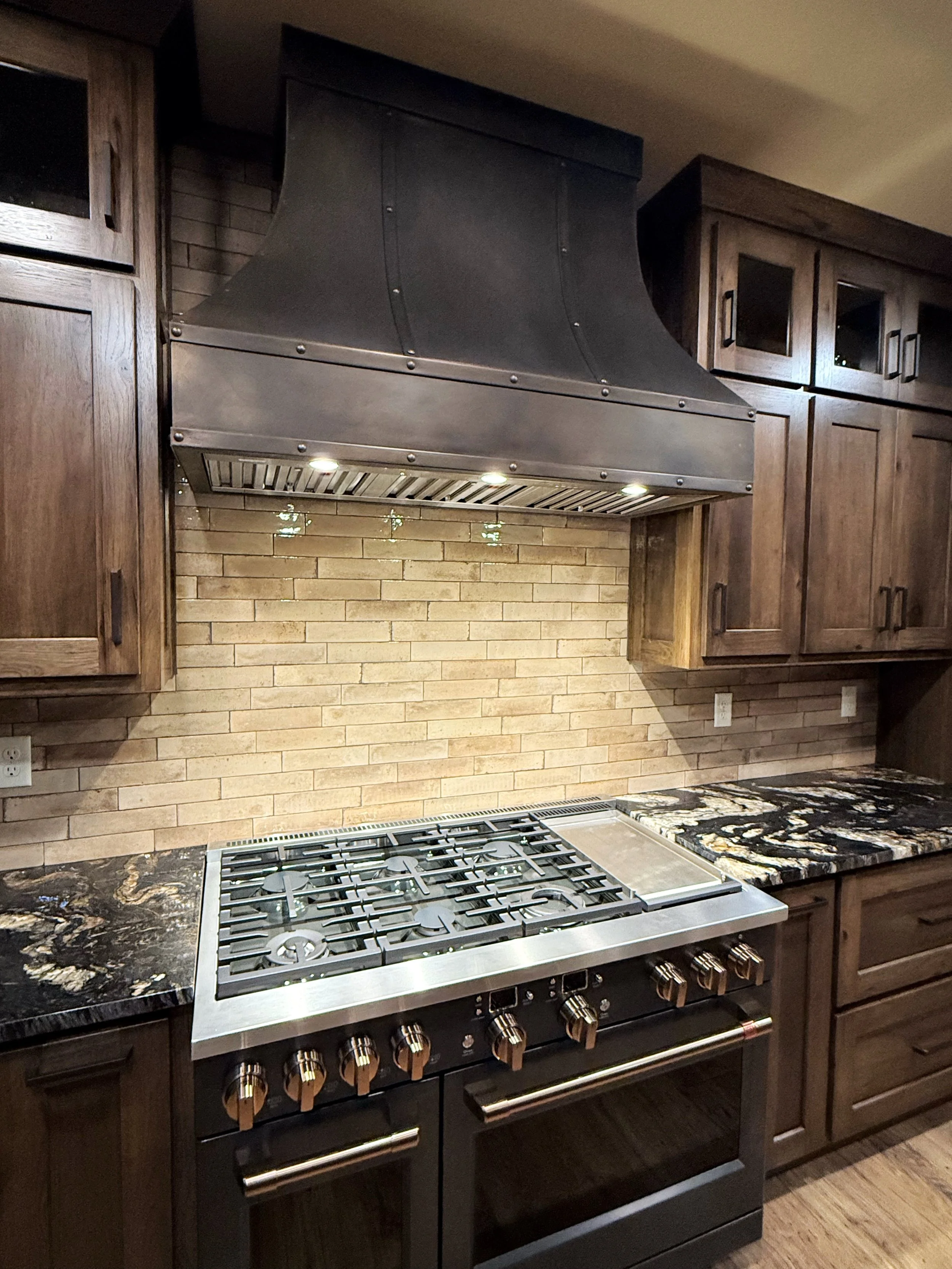 Left untreated, these metals shows that of a brushed grey/silver finish. We offer a few different patina treatments that turn the zinc into various dark colors. These colors vary from light black hues to brown hues. Patinas can vary in difference from hood to hood. Don’t worry, we will walk with you with pictures and tweaking to get you a patina you will love.